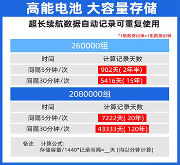 內(nèi)置鋰電池,一次充電可以連續(xù)使用一年以上,內(nèi)置蜂鳴器使其具有報(bào)警功能,同時(shí)報(bào)警也可以被記錄與導(dǎo)出。